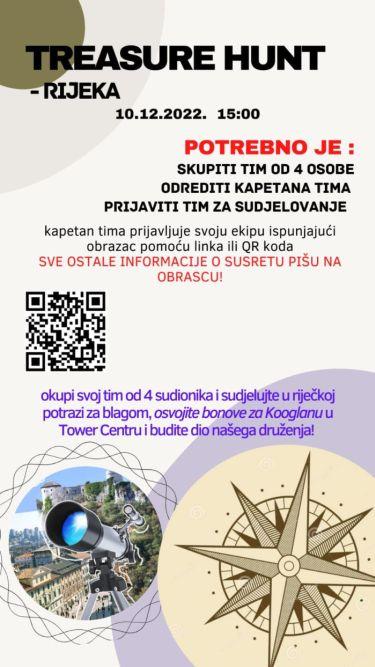 U subotu 10.12. učenici i učenice ovogodišnje Akcije za 5! u Rijeci (Ileana, Laura, Kali, Sara, Igor i Niko) u sklopu pobjedničkog projekta organizirali su Treasure hunt u Rijeci kako bi mladima približili grad u kojem žive i potakli ih na korištenje vanjskog prostora. Tema ovogodišnje Akcije bili su ‘prostori za mlade’, a ideja je proizašla iz potrebe za druženjem s vršnjacima i vršnjakinjama i istraživanjem javnih prostora grada u kojem žive.