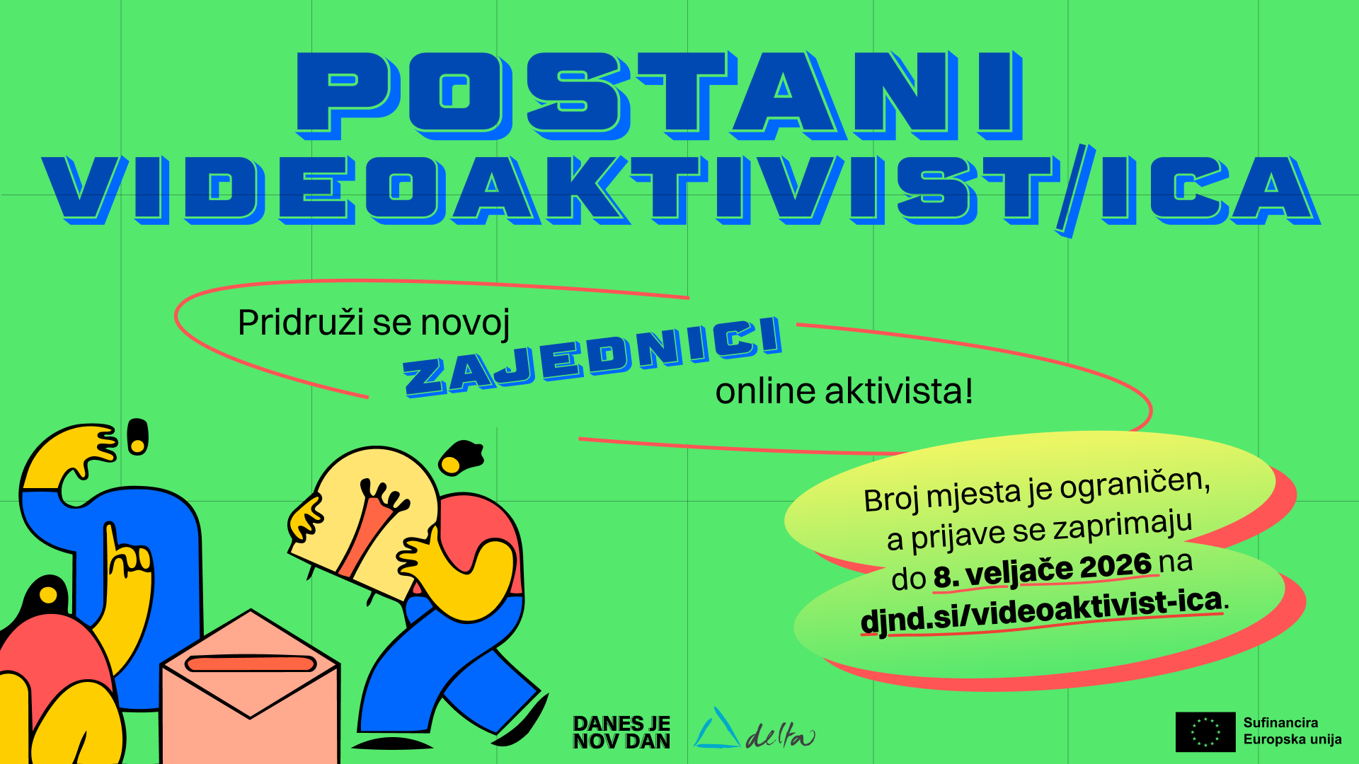 Trening se provodi u sklopu projekta “Civic Influencer Academy” kojeg provodimo u partnerstvu s organizacijom Danes je nov dan iz Slovenije. Projekt traje od 1.11.2025. do 31.10.2026., a sufinanciran je sredstvima Europske unije iz programa Erasmus+.