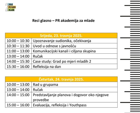 Reci glasno! – PR akademija za mlade realizira se u sklopu projekta “Grad po mjeRi mladih 2” kojega provodi Grad Rijeka u partnerstvu s Udrugom “Delta” i Centrom tehničke kulture Rijeka, a financiran je sredstvima Europske unije kroz Erasmus+ program.